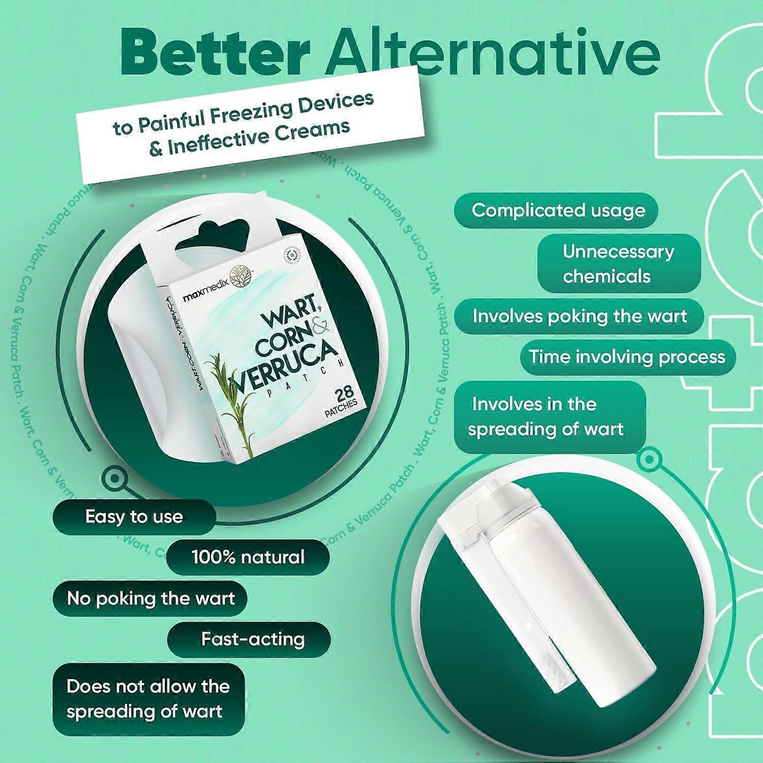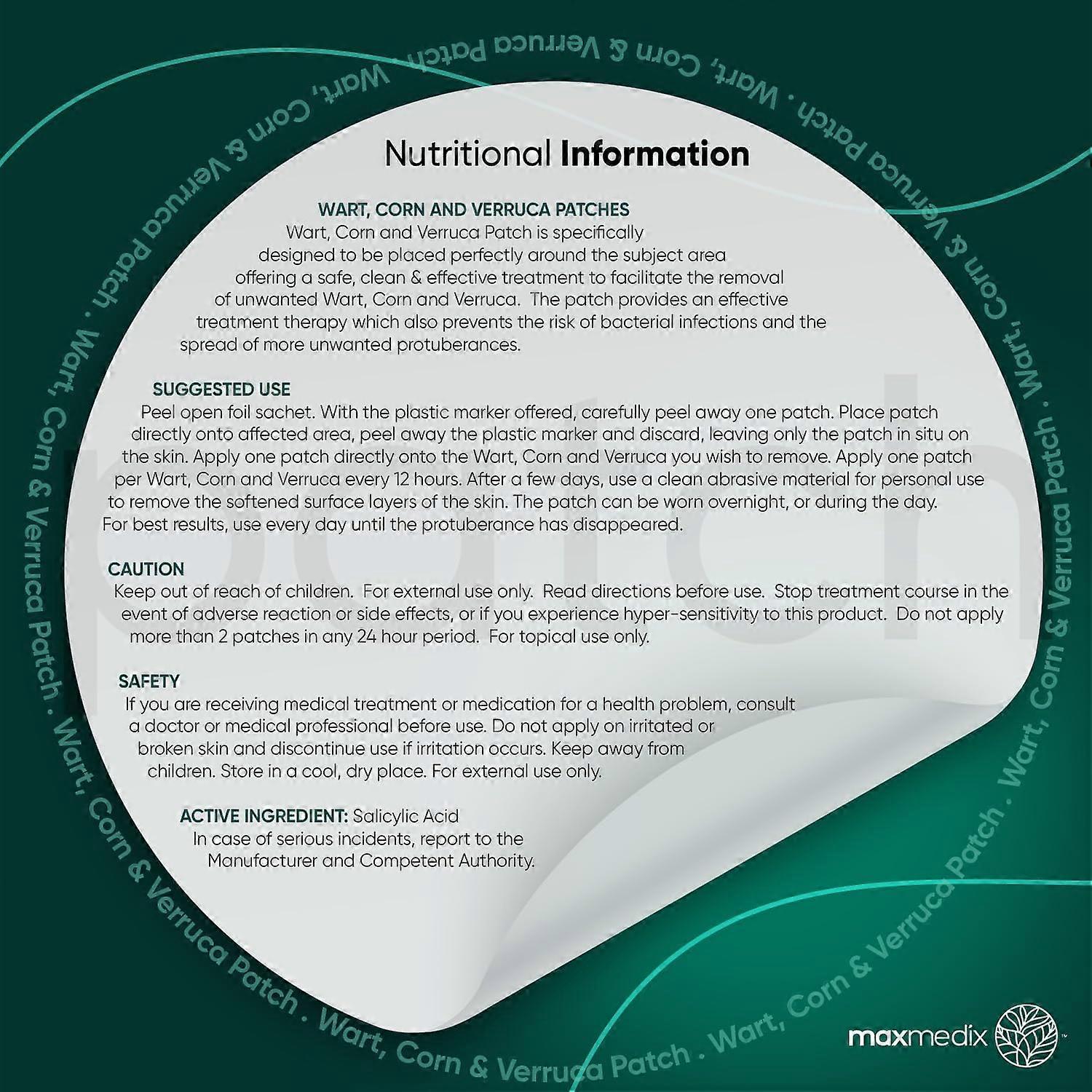 About this itemHEALTHY, CLEAR, & FRESH SKIN: Are you looking for ways to eliminate painful, unpleasant & unwanted skin growth? Look no further as our Wart, Corn & Verruca patches will help to remove warts & relieve foot discomfort. Formulated with salicylic acid, our wart remover for hand patches is known for breaking down the layers as they gently remove the tissue & eliminates growth. Our Wart remover pads penetrate your skin quickly & reach the base layer of the skin to peel & shed off automatically.PERFECT FOR FULL-BODY USE: Our wart remover is flexible & you can use our Veruca plasters on your hands, elbows, fingers, & other hard-to-heal body parts like toes or feet. Additionally, our wart & verruca removal patches are thin, blend perfectly with the skin & cause no side effects. Place the patches around the affected area & confidently carry out your daily routines, reassured that our wart removal patches are actively at work. With 28 easy-to-use patches, find comfort wherever you go USER-FRIENDLY & COMFORTABLE: Our wart & verruca remover patches are designed to stay in place with all-day strong adhesive. To use, peel one wart removal patch, apply it on the affected area & replace it after 12 hours. The preciseness of our wart remover for hand minimises contact with skin & reduces the chances of spreading to other body parts. Whether you stand on your feet all day or are an adventure enthusiast, our wart remover will hold up to your active lifestyle with a gentle solution.Safety Information:Keep out of reach of children. For external use only. Read directions before use. Stop treatment course in the event of adverse reaction or side effects, or if you experience hyper-sensitivity to this product. Do not apply more than 2 patches in any 24 hour period. For topical use only. If you are receiving medical treatment or medication for a health problem, consult a doctor or medical professional before use. Do not apply on irritated or broken skin and discontinue use if irritation occurs. Keep away from children. Store in a cool, dry place. For external use only.Ingredients:Salicylic acid